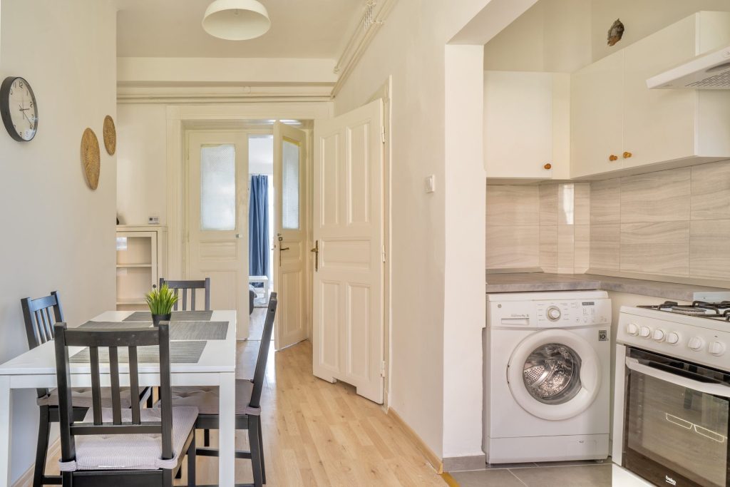Kitchen: dining table with chairs, washing machine, oven, hot plates, plates, cutleries, mugs, glasses, kettle, microwave, vacuum cleaner etc