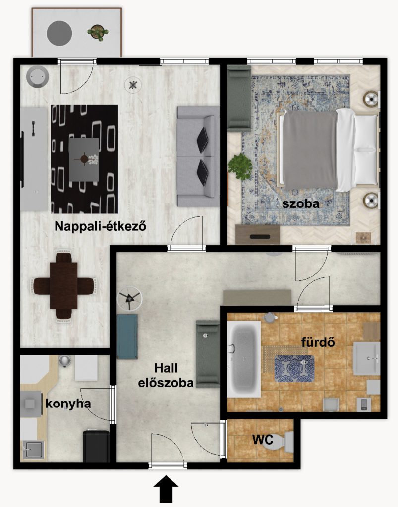 It has an ideal layout, in addition to the large living room (from which the terrace opens) and the spacious bedroom, it consists of a hall partially separated by a glass brick wall and a mechanized kitchen opening from there, as well as a bathroom with a bathtub and a separate toilet.