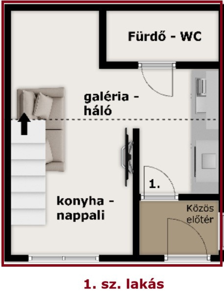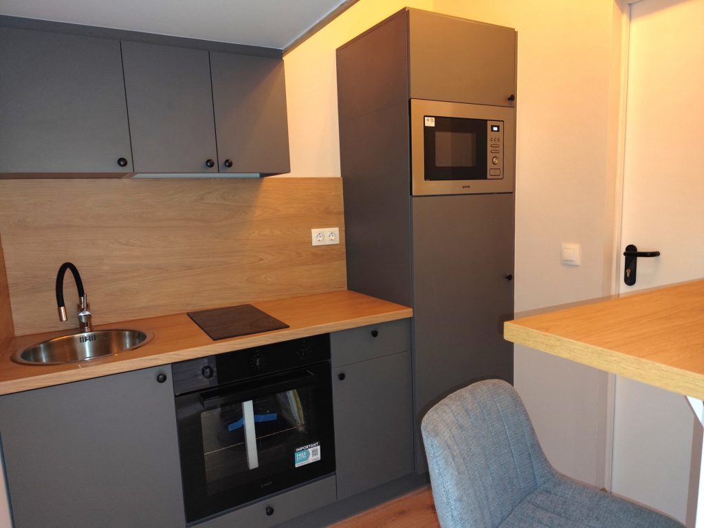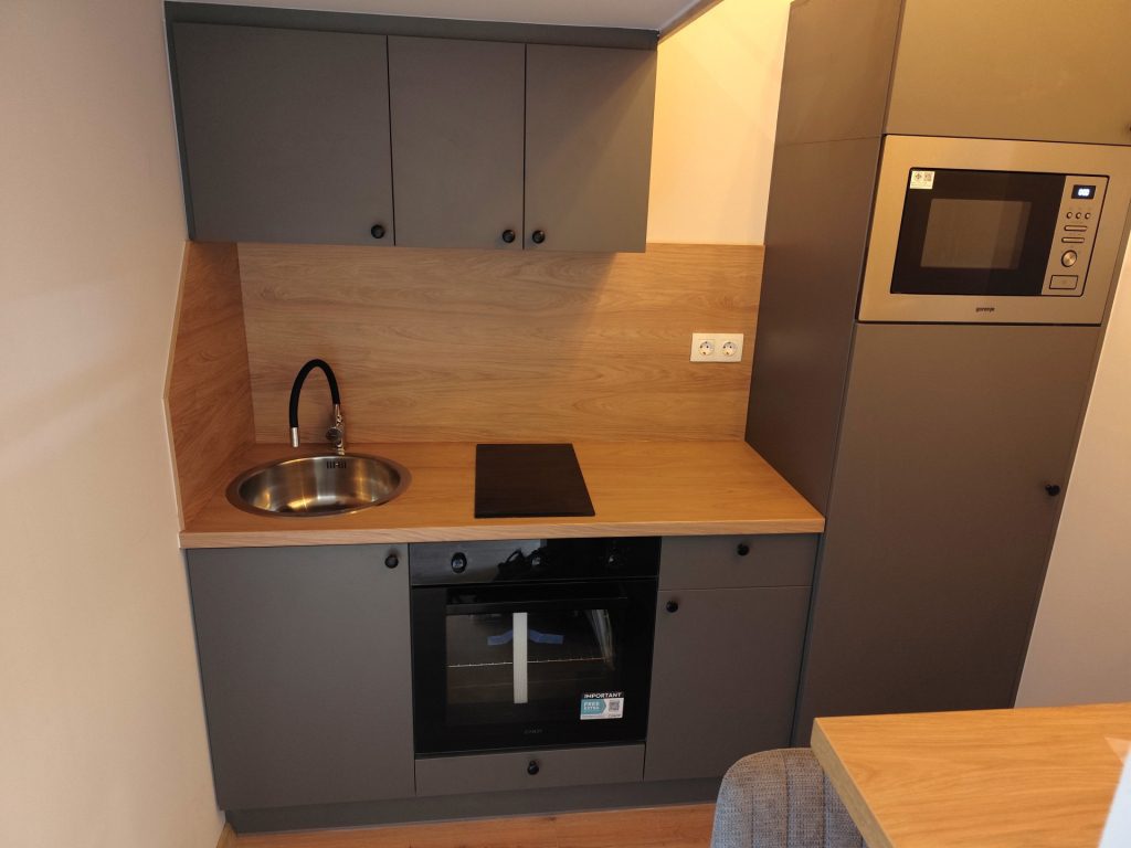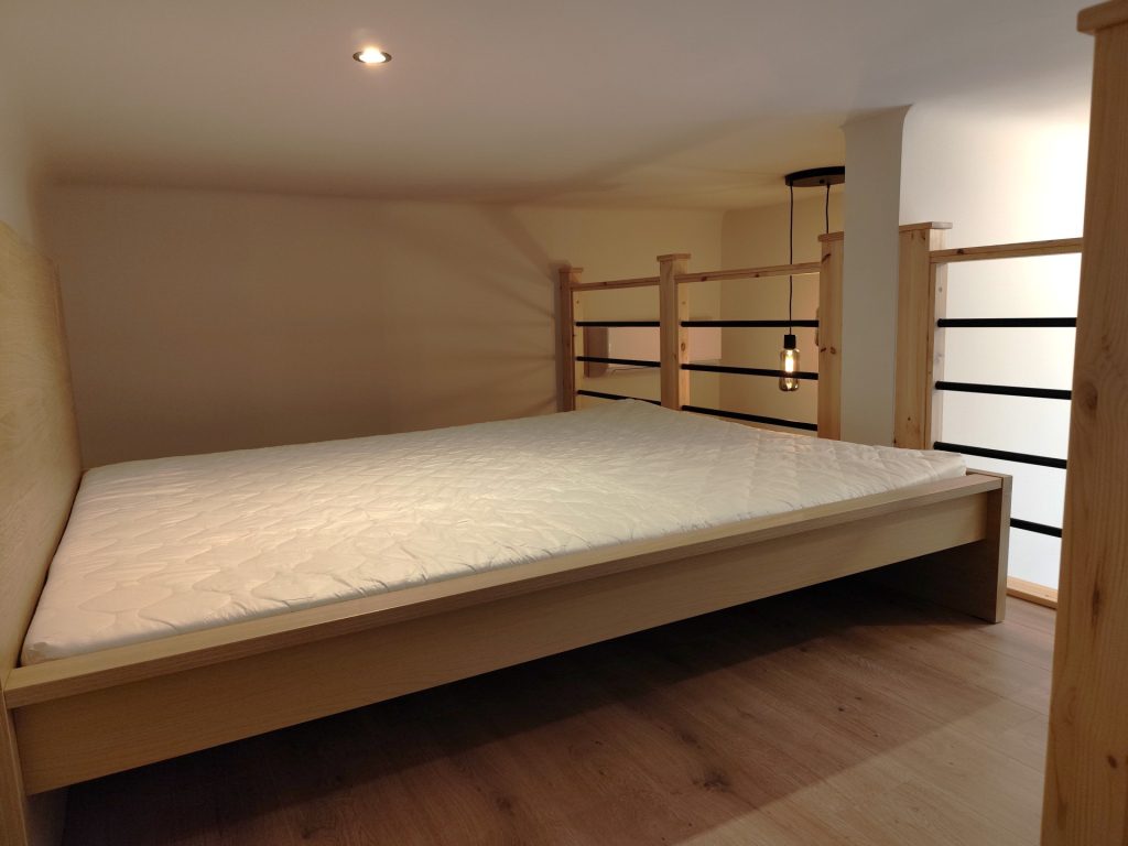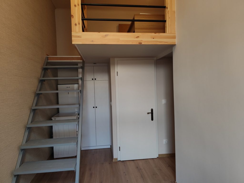 The mini apartment – which opens from a closed entrance hall – has a fully equipped kitchen with a dining counter, a living room, a bathroom with a built-in shower cabin, and a double bed on the gallery.