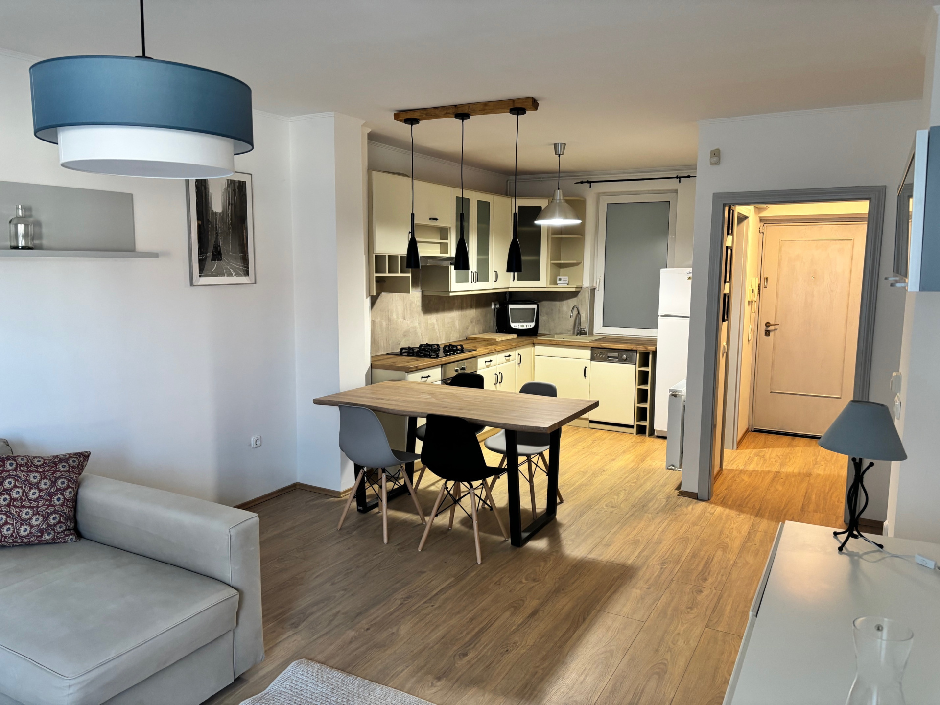 The apartment is furnished; American kitchen living room, bedroom, bathroom-WC, hallway, terrace layout. The walls are freshly painted, the coverings are new, The kitchen is equipped with modern, large household appliances – refrigerator, dishwasher, microwave.