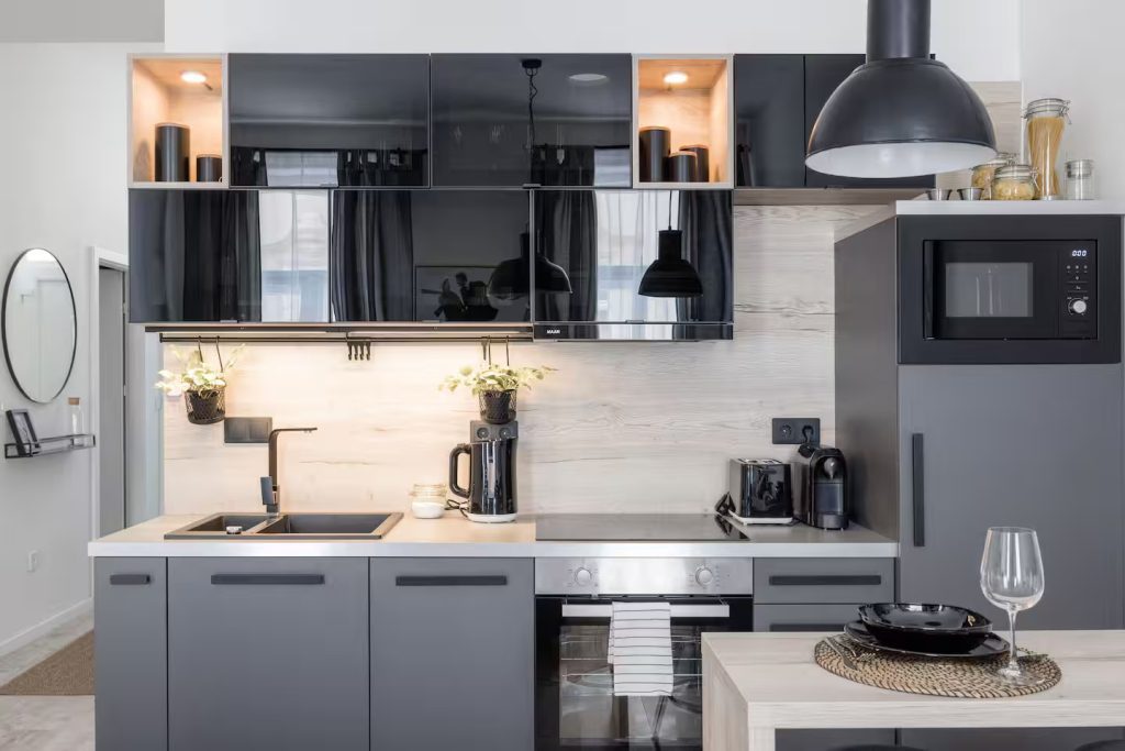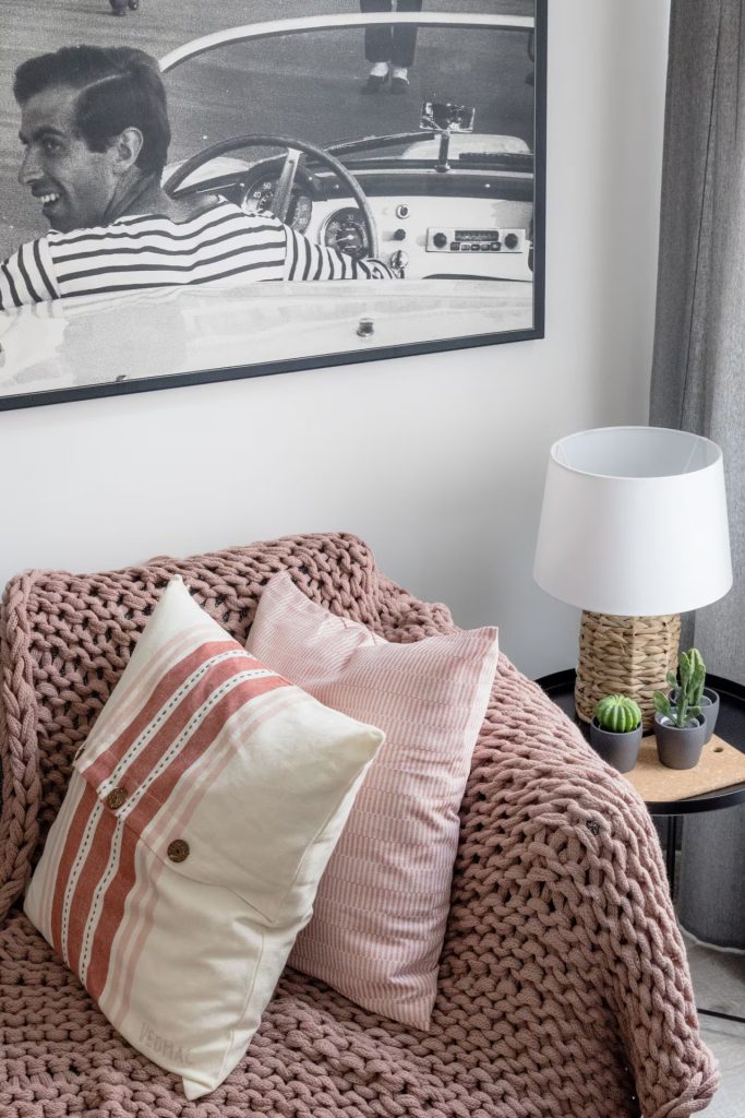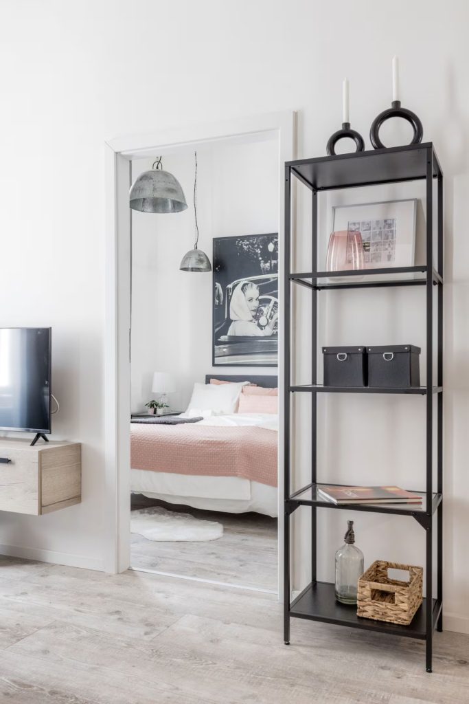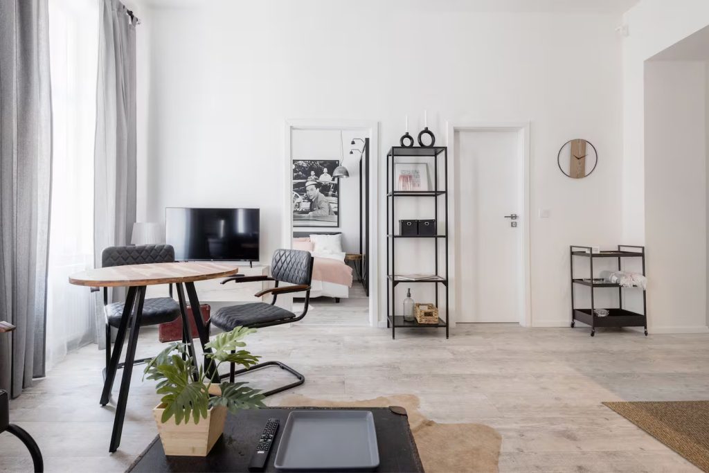The living area has been thoughtfully designed with a dining corner, relaxation area, and lounge space. From here, you can access the larger bedroom, which features a large built-in wardrobe with integrated lighting.