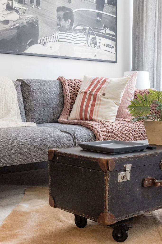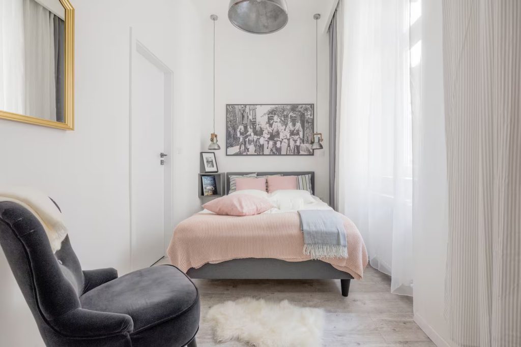 Inside, you will find a pleasant-sized open-plan living room with an American-style kitchen, as well as one smaller and one larger bedroom. As shown on the floor plan, one of the bedrooms includes a charming walk-in wardrobe.