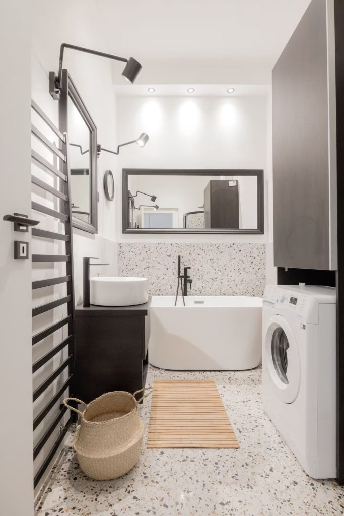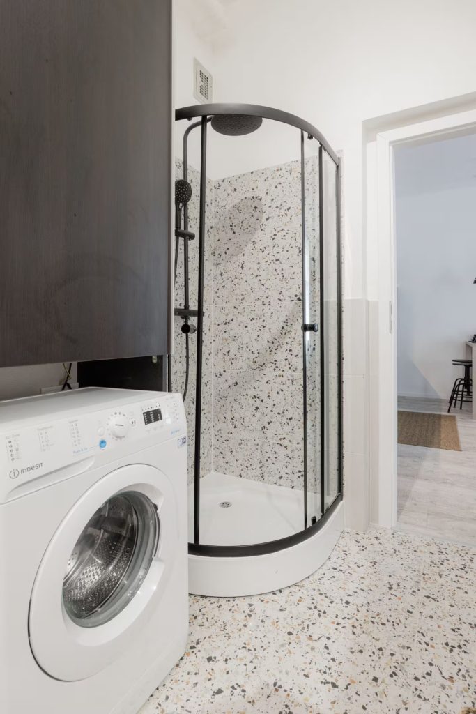 The bathroom meets every expectation — no need to choose between a bathtub or a shower, as both are available. A washbasin, washing machine, and towel radiator fit comfortably here.