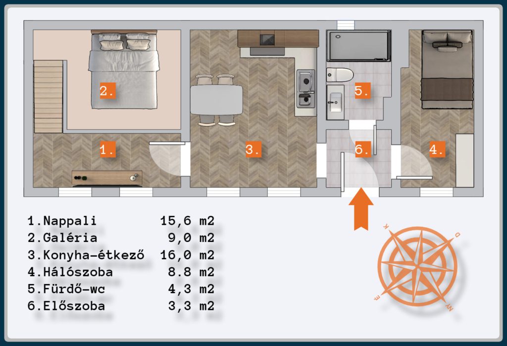 Distribution: entrance hall, kitchen-dining room, living room with gallery, bedroom, bathroom-toilet.